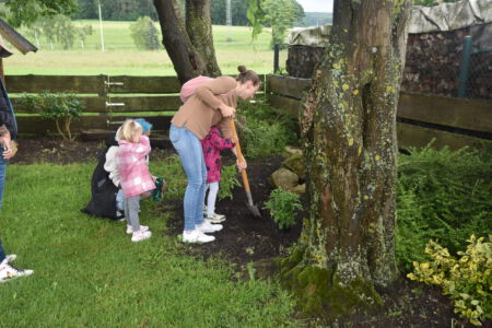 Es wurde Kaffee und Kuchen angeboten. Auch Crêpes waren auch für 3 Euro im Angebot. Getränke und Crêpes sind gut gelaufen. Auch die Bratwurstsemmeln haben sich gut verkauft. Die Kinder dürften eine Kräuterbutter selbst machen. Das wichtigste war aber das wir das Interesse der Kinder für die vielfältige Arbeit im Garten begeistern konnten. Sie konnten Blumen und Gemüse einpflanzen. Nebenbei konnten sie auch Obstmemory spielen.Darüber hinaus wurde auch gebastelt und gemalt. Zur Abwechslung war die Bundespolizei mit einem Stand und einem Fahrzeug bei uns, und die Kinder durften das Innere eines Polizeiautos erkunden. Der Johanniter wurde wegen dem schlechten Wetter abgesagt. Der Höhepunkt unserer Veranstaltung war die Wiedergründung der Kinder und Jugendgruppe. Dazu konnten wir 14 Kinder aktivieren, die den „Fledermäusen“ wieder Leben einhauchen sollen. Das erste habe wir am 22. 06.23 geplant. Treffpunkt ist um 14 Uhr im Dorfhaus, anschließend gehen wir zum Planks Hoffest. Der Jugendtag war für uns ein toller Erfolg.